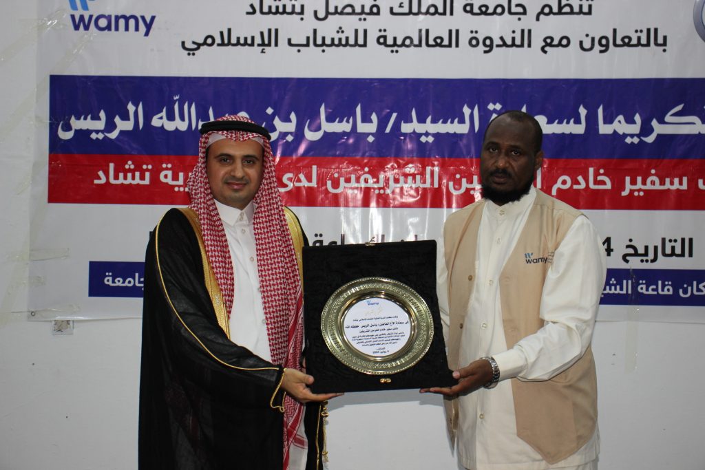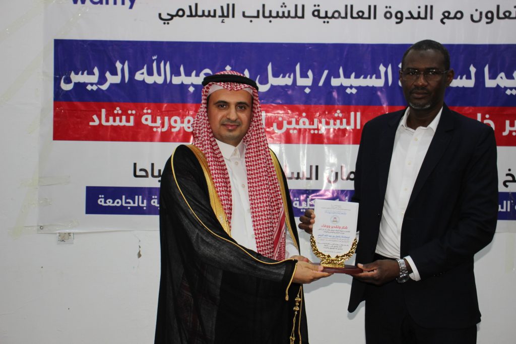 نظمت جامعة الملك فيصل بتشاد بالتعاون مع الندوة العالمية للشباب الاسلامي مكتب تشاد صباح الخامس من يوليو الجاري حفلا تكريميا على شرف نائب سفير خادم الحرمين الشريفين لدى البلاد سعادة باسل الريس وذلك شكرا و عرفانا على المبادرات التي قام بها سعادته دعما للجامعة و للبلاد بشكل عام كان ذلك بحضورنائب رئيس المجلس الاعلى للشؤون الاسلامية بجمهورية تشاد الأمين العام الشيخ عبدالدئم عبدالله و معالي رئيس الجامعة الاستاذ الدكتور محمد بخاري حسن و نائبه المكلف بالتعاون و الأمين العام للجامعة و كذا مدير الندوة العالمية للشباب الاسلامي كتب تشاد و عدد من العمداء و الاداريين